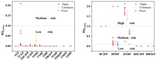 The ecological risk of individual OP triester (HQI-OPtri) and transformation product (HQI-OPtp).