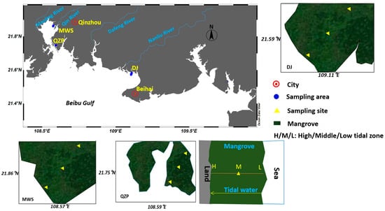 Surface sediment samples were collected and analyzed in three mangrove forests in the northern Beibu Gulf, South China Sea in October 2020, and detailed information on the selected sampling locations is provided in Figure 4 and Table S2. The Maowei Sea (MWS) mangrove wetland is located around the estuaries of the Qinjiang River, Mao Lingjiang River and Da Lanjiang River. Qinzhou Port (QZP) mangrove is close to the Qinzhou Port and also near a scenic area. Both the MWS and QZP mangrove wetlands belong to Qinzhou City, Guangxi Province, while the Dangjiang River (DJ) mangrove is located in rural areas of the Beihai city.