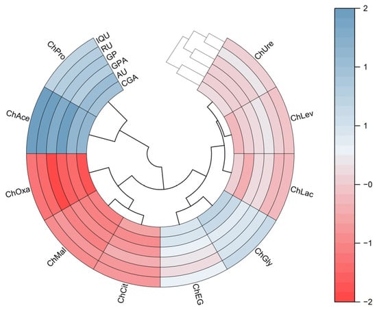 To illustrate the results, the yields of active components were standardized and shown as a heatmap (Figure 2). The DES samples are divided into three clusters. The ChPro and ChAce samples are isolated from all other clusters and have a high positive correlation with each other. Then, the ChOxa, ChMal, and ChCit can be grouped in the same cluster. Additionally, it is likely to group the ChEG, ChGly, ChLac, ChLev, and ChUre in the same cluster based on similarities. Compared to all other DESs, it was found that the ChAce was favorably correlated with the yield of iridoids, chlorogenic acid, and flavonoids, thus exhibiting significant differences in extraction efficiency.