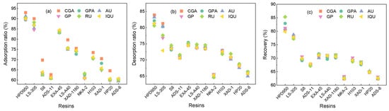 Figure 3a shows the absorption capacity of six target components in different macroporous resins. It was discovered that the polar resins had a higher absorption capacity than the other resins due to their bigger surface area and pore size according to Table 2. The process of adsorption was enhanced by resins with similar polarity and greater average pore diameters and surface areas [51]. Also, investigations into the desorption capacity are depicted in Figure 3b. The desorption ratio of active components was directly proportionate to the pore size of resins, among which the HPD950 resin exerted the best desorption performance. This can result from the physical force (such as the van der Waals force) and the influence of phenolic hydroxyl groups. Therefore, the HPD950 resin was most effective in recovering target compounds, and the recovery yields of 80.8%, 82.9%, 81.2%, 80.6%, 85.3%, and 79.8% were obtained for AU, GPA, GP, CGA, RU, and IQU (Figure 3c), respectively. Meanwhile, the fifth cycle in Figure 4 demonstrated extraordinary stability and repeatability. Therefore, the HPD950 resin had great sustainability and showed considerable promise for use in the recovery of iridoids, flavonoids, and chlorogenic acid.