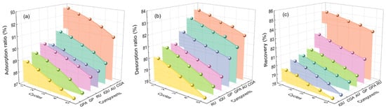 Recyclability results of HPD950 resins on adsorption (a), desorption (b), and recovery (c).