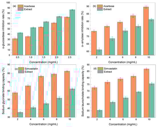 In vitro hypoglycemic and lipid-lowering activity of EUL extract: (a) α-glucosidase inhibition; (b) α-amylase inhibition; (c) sodium glycinate binding capacity; and (d) sodium taurocholate binding capacity.