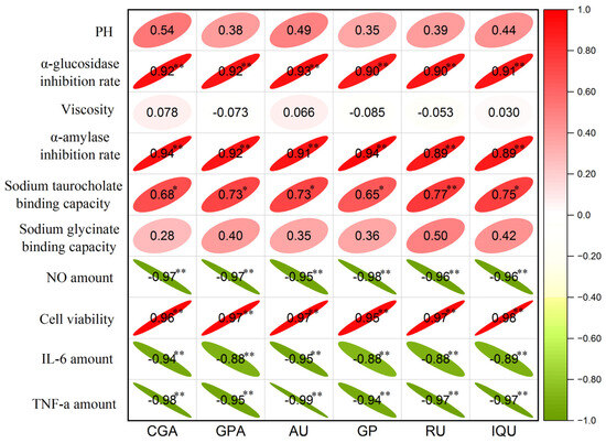 In order to examine the link between six active components with the biological activity of EUL extract and the physicochemical characteristics of DESs, the correlation coefficients of Pearson were obtained and the results are displayed as a heatmap (Figure 7). A strong association between active components and biological activity was found by correlation analysis. The α-glucosidase activity, α-amylase activity, and cell viability were positively correlated with all six active components (p < 0.01). The sodium taurocholate binding capacity was positively associated with RU (p < 0.01), CGA (p < 0.05), GPA (p < 0.05), AU (p < 0.05), GP (p < 0.05), and IQU (p < 0.05). While the NO amount, IL-6 amount, and TNF-α amount was negatively associated with all six active components (p < 0.01).