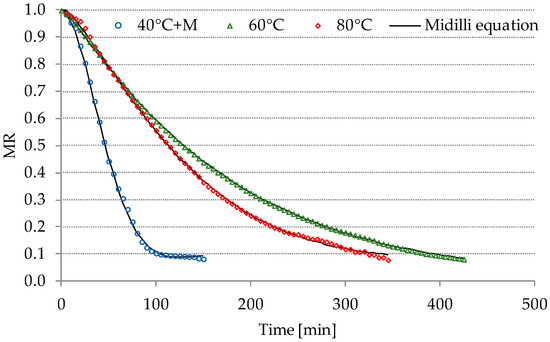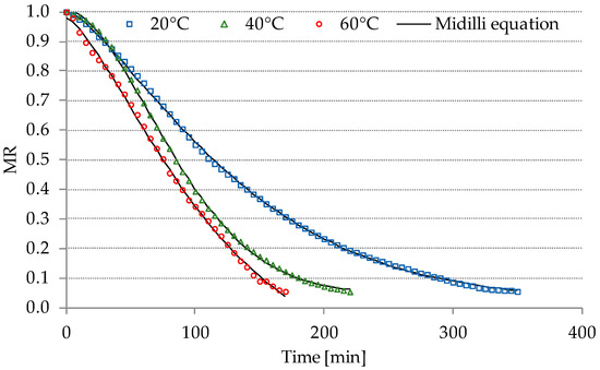 where ut stands for the water content during the drying process (kg H2O·kg−1 DW) and u0 represents the initial water content (kg H2O·kg−1 DW). The equilibrium water content in this equation was disregarded because its value is insignificant in relation to u0 and ut. This kind of simplification is frequently employed and has little effect on the drying kinetics results [51].