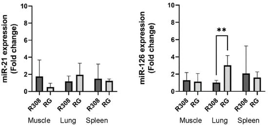 Expression levels of miR-21 and miR-126 in the two broilers (R308 and RG) in the three tissues: muscle (breast), lung, and spleen; the experiments were conducted with six conventional R308 chickens and five slow-growing RG chickens. Data are presented as means ± SD. ** symbol means statistically significant difference between bars (p < 0.01).