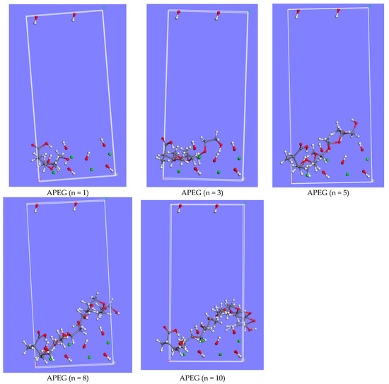 Several PCEs with different side-chain lengths were explored, as shown in Figure 1. Taking a polymerization degree of n = 1 as an example, the PCE models after geometry optimization are shown in Figure 9 [37,42].