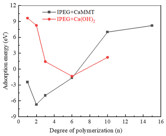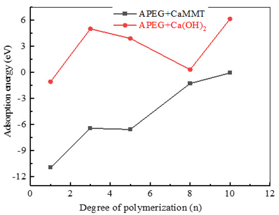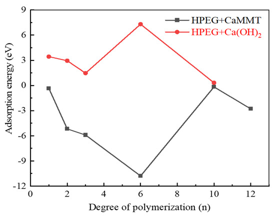 Figure 5 presents a comparison of the adsorption energies of HPEGs with different polymerization degrees on CaMMT and CH.