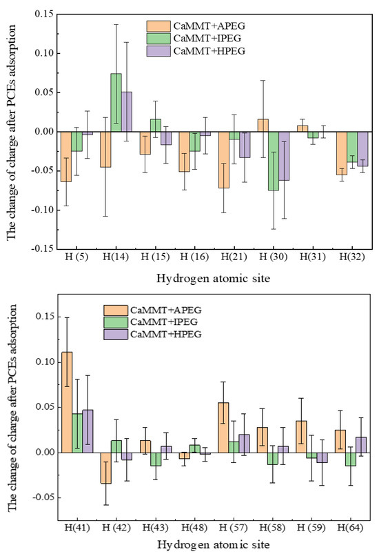 In our earlier analysis of electronic distribution and structures, we illustrated the specific charge distribution of different atoms through Mulliken charge populations [12,35,36]. Leveraging the adsorption models of different PCEs on CaMMT and utilizing the hydrogen (H) atom as an example, the Mulliken population analysis for various PCEs is presented in Table 1, while an error bar chart for the charge of H atoms after adsorption is shown in Figure 8.
