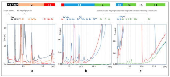 The influence of the type of filter on the attenuation of signals coming from the detection elements on the quality of the spectrum obtained for a hair sample for different X-ray energy ranges (a–c). The color of the spectral line corresponds to the background with the specified filter type above the spectra. Filter 5 was excluded from further studies. *, **—selected signals for elements represented by at least two peaks related to X-ray emitted when replenishing the K shell with electron—Kα, Kβ, respectively.