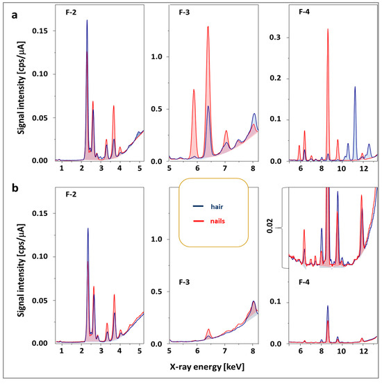 ED-XRF spectra obtained for hair and nails containing the highest (a) and the lowest (b) amounts of metals in examined samples.