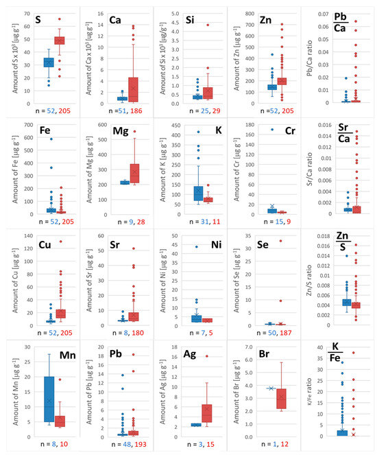 It can be easily noticed in Figure 6 that for elements, such as Ag, Br, Ca, Cu, Mg, Mn, S, Si, and Sr, the interquartile range was the widest. In the case of Ag, Br, and Mn, the number of the results was very low, and statistical dispersion was very high. This is the effect of a low signal-to-noise ratio, typical for amounts close to the lower limit of quantitation. Distribution of amounts for Ca, Cu, Mg, S, Si, Sr, Fe, and Zn may result from various commonly used care treatments, such as cleansing, conditioning, coloring, and styling [40]. It can influence the hair fiber’s condition and increase its ability to adsorb metal ions. All these elements, except strontium, are essential for humans, which can cause a risk to health in the case of prolonged exposure, resulting in the replacement of calcium ions.