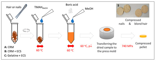 The scheme of preparing hair and nails (A) for measurement using ED-XRF and reference pellets (B,C) for calibration. CRM—certified hair reference materials, ECS—environmental calibration solution containing metal ions, S—photographs of pellets prepared for measurements.