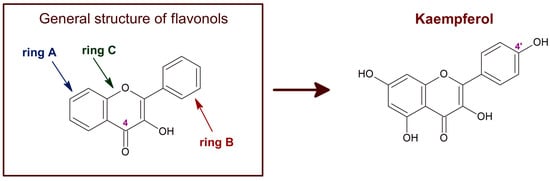 Chemical structure of flavonols in general and of kaempferol. The C4 position of the characteristic carbonyl group of flavonols is marked. Kaempferol, also known as 3,4′,5,7-tetrahydroxyflavone [chemical name: 3,5,7-trihydroxy-2-(4-hydroxyphenyl)-4H-1-benzopyran-4-one], bears a single hydroxyl group in ring B, at position 4′.