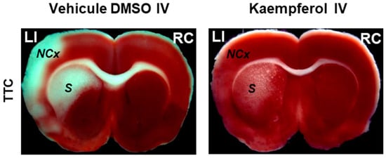 Kaempferol protects against ischemia/reperfusion-induced brain damage. The images of brain slices stained with 2,3,5-triphenyltetrazolium chloride (TTC) show the reduction of the damage extension in brain areas (NCx: neocortex and S: striatum) after kaempferol treatment in rats subjected to ischemia/reperfusion. LI and RC mean left ischemic and right control hemispheres, respectively. Meaning of other abbreviations used in this figure: DMSO (dimethyl sulfoxide) and IV (intravenous administration).