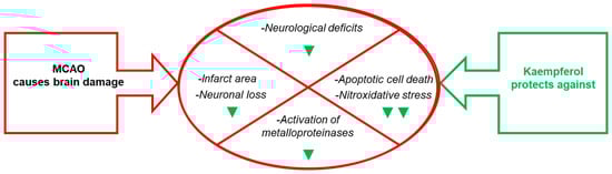 Effects of kaempferol administration highlighted in this section. Kaempferol reduces MCAO- induced brain damage in the infarct area, neurological deficits, apoptotic cell death and neuronal loss, as well as the levels of biomarkers of brain damage. The green symbols indicate attenuation by kaempferol: ▼ and ▼▼ mean partial and nearly complete attenuation, respectively. See the text for further details.