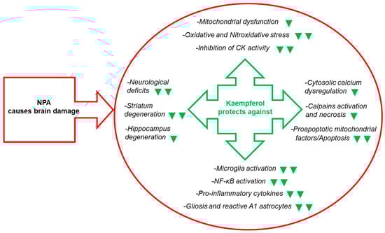 Kaempferol reduces NPA-induced brain lesion, neurological dysfunctions, and, also, the levels of many biochemical and cellular biomarkers of brain degeneration. The green symbols indicate attenuation by kaempferol of the NPA-induced change: ▼ and ▼▼ mean partial and nearly complete attenuation, respectively. Abbreviations used in this figure: CK (creatine kinase) and NF-κB (nuclear factor kappa light-chain enhancer of activated B cells). See the text for further details.
