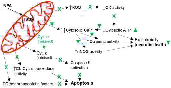 NPA is a suicide inhibitor of succinate dehydrogenase [100,101,102] and causes the rapid loss of ATP in cultured neurons in vitro [103,104]. The enhanced generation of ROS that activate cell death pathways due to the impairment of mitochondrial function has been accepted to play a major role in the neurotoxicity of NPA [94,104,105,106,107,108,109]. The relevance of NPA-induced striatal degeneration models as animal models of HD is further supported by reported anomalies in mitochondrial function and oxidative stress in the brain degeneration of HD patients [106,110].