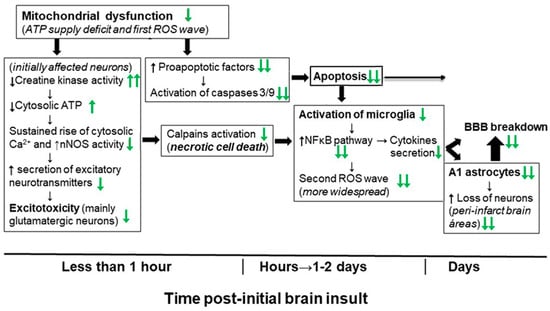 Schematic time course presentation of the major molecular and cellular mechanisms involved in brain damage induced by an ischemic brain stroke or by NPA injections, which has been shown to be strongly inhibited by kaempferol administration (indicated by green arrows) in experimental animal models, analyzed in detail in Section 4 of this review. Black arrows indicate the effects of ischemia-reperfusion and NPA administration. Two green arrows mean nearly complete inhibition by administration of kaempferol doses producing an efficient protection against brain damage and associated neurological dysfunctions. The time range of the initial events leading to caspases activation and necrotic neuronal death has been extrapolated to the brain from the data obtained using a variety of neuronal and cellular cultures in vitro. BBB means blood–brain barrier.