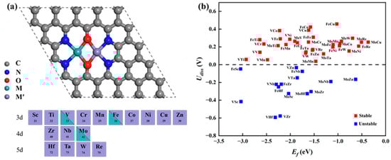 Based on the successful synthesis of DACs possessing N4O2 coordination in experiments, we constructed 48 types of MM′@N4O2-G DACs on this substrate, including 3 homonuclear DACs, VV/MoMo/FeFe@N4O2-G, and 45 heteronuclear DACs, MM′@N4O2-G, where M = V/Fe/Mo and M′ = Sc ~ Zn, Zr, Nb, Mo, Hf, Ta, W, and Re. The optimized structures are shown in Figure 1a. To assess the thermodynamic stability of these catalysts, we calculated the formation energy (Ef) as follows: