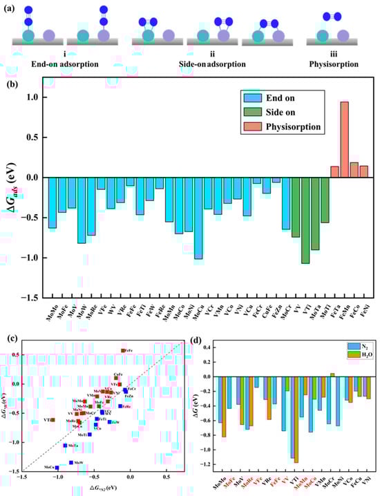 (a) Schematic structure of N2 adsorption on catalyst. (b) The adsorption free energy of N2 on the catalyst. (c) Comparison between ΔG*H and ΔG*N2. (d) Comparison between ΔG*N2 and ΔG*H2O, where the red coordinates represent the catalysts that meet the requirements.