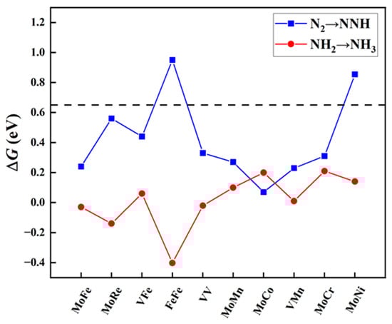 Free energy changes (ΔGN2→NNH and ΔGNH2→NH3, eV) for the first and last protonation steps on MM′@N4O2-G. The black dashed line indicates the screening criteria (∆G = 0.65 eV).