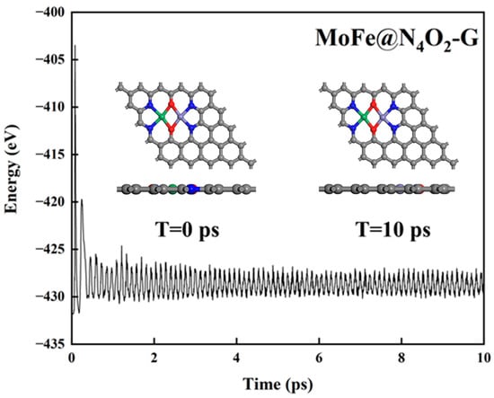 Total energy variation of MoFe@N4O2-G for AIMD simulation at 500 K for 10 ps. The C, N, O, Mo, and Fe atoms are labeled as gray, blue, red, green, and lavender balls, respectively.