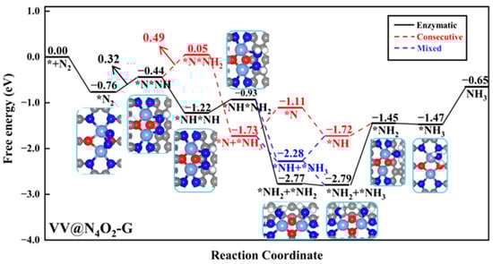 VV@N4O2-G was the only homonuclear DAC that remained after the screening process. N2 molecules exhibit side-on adsorption on the catalyst surface, where two N atoms bond to two V atoms, with ΔG*N2 of −0.76 eV. The Gibbs free energy diagram for the NRR on VV@N4O2-G and corresponding intermediate structures are shown in Figure 6. As shown in the figure, for the VV@N4O2-G catalyst, the potential-determining step (PDS) in the consecutive pathway is the second step of the protonation reaction (*NNH + H+ + e− → *NNH2), with a ΔG value of 0.49 eV. The PDS of both the enzymatic and mixed pathways is the first protonation step (*N2 + H+ + e− → *NNH), with a ΔG value of 0.32 eV. The first four protonation steps in the two pathways lead to the *NHNH2 intermediate. In the fifth protonation step, a proton–electron pair attacks one N atom in the *NHNH2 intermediate, forming *NH2NH2 or *NHNH3, with ΔG values of 1.84 and −1.35 eV, respectively, indicating that the former is more feasible in thermodynamical terms. Subsequently, *NH2 + *NH2 undergoes two hydrogenation steps to produce two adsorbed NH3 molecules, with ΔG values of 0.02 and −0.02 eV. It is noteworthy that the desorption of the two NH3 molecules from VV@N4O2-G requires relatively high energies, at 1.34 eV and 0.82 eV, respectively. However, previous studies have demonstrated that NH3 generated in strong acid solutions can be easily reduced to NH4+ []; hence, the desorption of NH3 is not extensively considered here. Our calculations show that for VV@N4O2-G, the most probable reaction pathway is the enzymatic pathway, with a UL of −0.32 V.