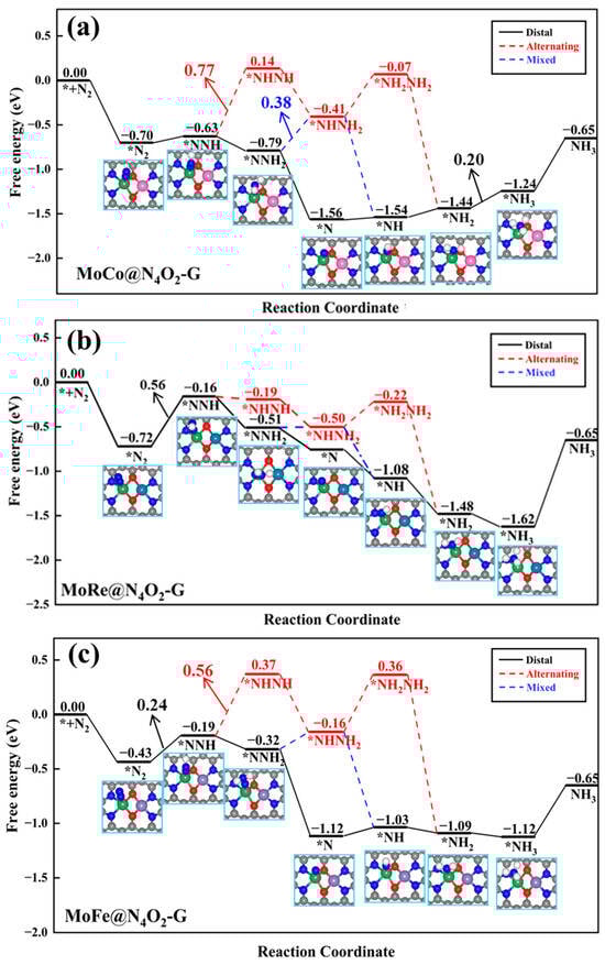 Gibbs free energy diagrams of NRR on (a) MoCo@N4O2-G, (b) MoRe@N4O2-G, and (c) MoFe@N4O2-G. The C, N, O, H, Mo, Co, Re, and Fe atoms are labeled as gray, blue, red, white, green, pink, dark green, and lavender balls, respectively.