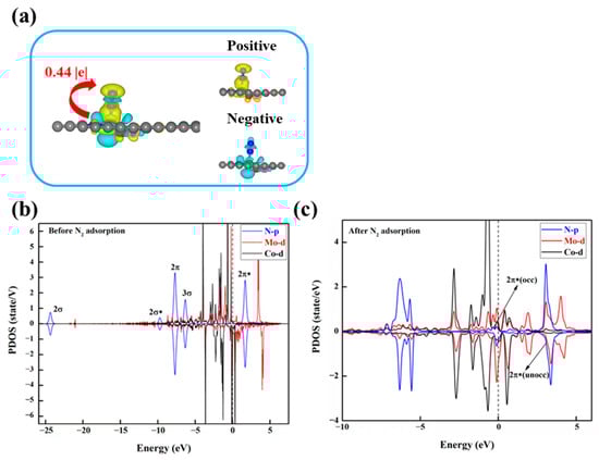 (a) Charge density differences after N2 adsorption on MoCo@N4O2-G and Bader charge (Q*N2, |e|) after N2 adsorption. The C, N, O, Mo, and Co atoms are labeled as gray, blue, red, green, and pink balls, respectively. The electrons accumulation and loss are represented by yellow and cyan areas. (b) PDOS before and (c) after N2 adsorption on MoCo@N4O2-G. The black dashed line represents the Fermi energy level.