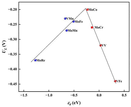 Moreover, to investigate the mechanism of the synergistic effects between diatomic sites, we explored the influence of the d-band center (ɛd) of the active sites on the reaction activity. Specifically, we evaluated the d-band center of the Mo atom in the case of MoCo@N4O2-G and assessed the d-band center of the two V atoms in VV@N4O2-G. As shown in Figure 10, a distinct volcano-shaped relationship exists between the limiting potentials of these eight DACs and the d-band centers of the active metal atoms. Notably, the highly efficient MoCo@N4O2-G is located near the peak of the volcano plot. The volcano curve suggests that the superior NRR performance of DACs is attributed to the appropriate position of the d-band center. Additionally, it is evident that although the metal M′ (in the case of heteronuclear DAC) does not directly participate in the hydrogenation process of N2, the synergistic effects between the M′ and M sites effectively regulate the position of the d-band center of the active site, thereby impacting the reaction activity.