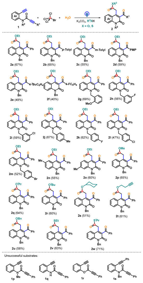 We next devoted our effort to explore the scope of this radical-triggered multicomponent annulation by taking advantage of different alcohols as nucleophiles. The compound 1,7-diynes 1a was subjected to the treatment of various alcohols consisting of linear (methyl, but-3-yn-1-yl, benzyl), branched (isopropyl, isobutyl) and cyclic (cyclohexyl), which were proven to be applicable for this method, as targets 2p–2u were generated in 51–65% yields. Promisingly, both ethanethiol and propane-2-thiol are good candidates, providing the quinolones-containing ethanethioate 2v–2x in 63% and 71% yields, respectively. It is interesting and unexpected that thiols act as nucleophilic reagents and solvents, rather than as radical donors [48,49]. Unfortunately, N-Me protected 1p or N-unprotected amide-linked 1,7-diyne 1q and ester linked 1,7-diyne 1r were not effective reaction partners, as they were unsuccessfully transformed into corresponding products. Furthermore, the preformed substrate 1s with two internal alkyne moieties was examined, but the reaction did not proceed under this catalytic system and 1,7-diyne 1s was recovered, showing that terminal alkynes on starting material play an important role for this transformation.