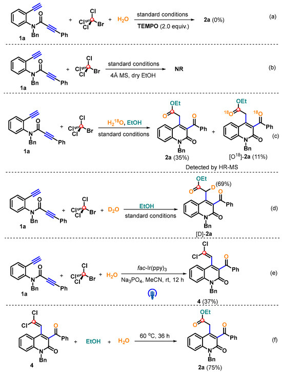 Several control experiments were performed to gain mechanistic insight into the reaction pathway. Firstly, the use of a radical inhibitor TEMPO (2,2,6,6-tetramethyl-1-piperidinyloxy) successfully suppressed the reaction process, and the result confirmed that a trichloromethyl radical may be involved in these transformations (Scheme 4a). When a 4 Å molecular sieve was employed as dehydrating agent and dry EtOH as solvent under standard conditions, the reaction process was completely inhibited (Scheme 4b). In addition, the reaction was carried out in the presence of H218O (98 atom% 18O), and the products 2a and 2a-O18 were identified by HR-MS in a 3:1 ratio (Scheme 4c). These two survey results indicated that the oxygen source of the ester and carbonyl group in target products come from water. The deuterium-labeling experiment was performed to confirm the hydrogen source of methylene. In the presence of D2O, the deuterated product [D]-2a was obtained with the percentage content of deuterium being 69% (Scheme 4d). The reaction between 1a with CBrCl3 in wet-acetonitrile at room temperature in the presence of K3PO4 as base, which underwent Kharasch addition/1,5-(SN″)-substitution cascade process to form gem-dichlorovinyl carbonyls product 4 with 37% yield, followed by reaction with EtOH and H2O (v/v, 100:1) at 60 °C for 36 h, leading to the desired product 2a in 75% yield. These observations suggest that gem-dichlorovinyl may serve as a key intermediate for the generation of product 2 (Scheme 4e,f). Finally, several fluorescence quenching experiments indicated that CBrCl3 was a more efficient quencher of the excited state of fac-Ir(ppy)3* than 1,7-diyne 1a (Figure 1, see the Supplementary Materials for details).