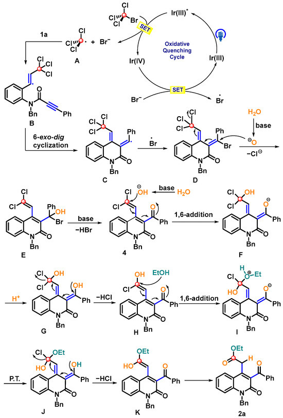 Combined with these experimental outcomes and previous related works [17,18,19,20], we proposed a plausible mechanism about this photoredox-catalyzed multicomponent annulation of 1,7-diynes. As shown in Scheme 5, the photocatalytic cycle was initiated by the activation of Ir(III) with blue light irradiation to form the excited state Ir(III)* species, which reacts with BrCCl3 to yield trichloromethyl radical A and a bromine anion, together with Ir(IV) complex via a single electron transfer (SET). Next, the radicals A can be trapped by the terminal carbon–-carbon triple bond of 1,7-diyne 1a to provide the alkenyl radical B, which undergoes 6-exo-dig-cyclization to give intermediate C. The resulting bromine anion was oxidized by Ir(IV) complex to produce Br radical [50,51], followed by radical cross coupling with C to obtain intermediate D and to regenerate Ir(III) species. Subsequently, the intermediate D reacts with OH− from H2O to afford the intermediate E through 1,5-(SN″)-substitution, which eliminates one molecule of HBr to assemble a key intermediate 4. The intermolecular 1,6-addition of hydroxyl anion into intermediate 4 gives intermediate F, followed by protonation and removal of HCl to furnish intermediate H, which then undergoes nucleophilic 1,6-addition with ethanol, following by proton transfer (P.T.) and removal of HCl to generate intermediate K. Finally, the intermediate K transforms into the desired products 2a through tautomerization.