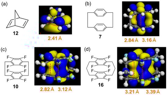 Furthermore, the distances between the benzene rings (hereinafter referred to as ring distances) and the overlap between the lowest unoccupied molecular orbitals (LUMOs) were investigated using DFT calculations. More specifically, the intramolecular formation of C–C bonds between the benzene rings was focused. Typically, 12 is converted to 13 via a [2+2] intramolecular photocycloaddition [28,29]. The distance between the two double bonds of 12 is very short (~2.4 Å), and the LUMOs localised on these bonds exhibit good overlap (Figure 3a).