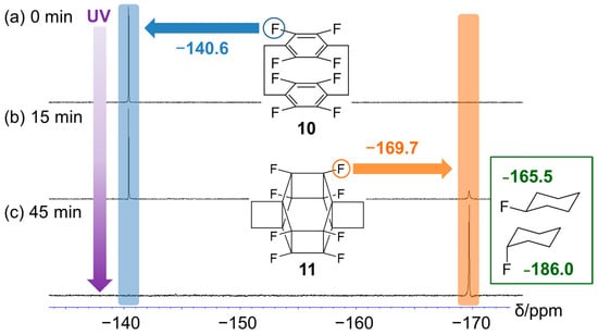 Figure 4 shows the time-dependent 19F NMR spectra recorded during the photoreaction of 10, revealing the emergence of a new peak corresponding to 11 at approximately −170 ppm after 15 min (Figure 4a). After 45 min, this peak was the only signal observed, and that of 10 at approximately −140 ppm disappeared (Figure 4b). The chemical shift of the former peak (−170 ppm) is between those of exo- (−165.5 ppm) and endo-fluorocyclohexane (−186.0 ppm) and is, therefore, reasonable [30]. Similarly, the methylene proton peak at ~3.25 ppm disappeared after UV irradiation (Figure S6).