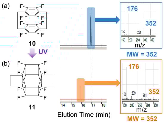 Figure 5 shows the GC–MS analysis results of pristine and irradiated samples. After UV irradiation, the peak of the starting material at ~17 min (Figure 5a) disappeared, and a new peak emerged at 16 min (Figure 5b). The molecular weights corresponding to these two peaks were the same (m/z = 352), indicating that the observed transformation corresponded to photoisomerisation. Considering the high symmetry indicated by the results of NMR analysis, these observations agreed with the formation of 11.