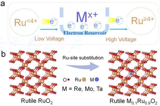 (a) Schematic diagram of the electron transfer process under different potentials. (b) Schematic image of partial substitution of Ru with Re, Mo, and Ta.