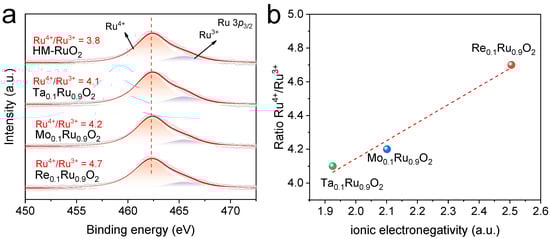 The surface compositions and the corresponding electronic structures were further investigated by X-ray photoelectron spectroscopy (XPS), as the electrochemical reaction process takes place at the surface of the catalyst. As shown in Figure 3a and Table S1, the Ru 3p3/2 signals could be deconvoluted into two doublets. The two typical peaks of Ru 3p3/2 obtained for all samples were centered at 462.3 and 465.5, indexed to Ru4+ and Ru3+ species, respectively [14,36]. This result revealed that the oxidation state of Ru in the pre-catalysts was an Ru4+/Ru3+ mixture, which offered the potential for electron transfer. A linear relationship between the ratio of Ru4+/Ru3+ and ionic electronegativity was found, as shown in Figure 3b. The areal ratio of Ru4+/Ru3+ increased as the ionic electronegativity of the dopant metal increased from 1.925 (Ta5+) to 2.505 (Re7+), indicating the intensified valence state of Ru because the high-valence foreign metal with higher ionic electronegativity induced a reduced electron density in Ru. This trend of the variation in Ru valence was consistent with a previous report [23]. It was reported that Ru-based catalysts with a higher oxidation state of Ru exhibited higher OER activity due to optimized binding energy with oxygen intermediates [37]. In addition, the existence of high-valence foreign metals was also verified by their corresponding XPS spectra (Figure S6). According to previous reports, the oxidation states of Re, Mo, and Ta in the corresponding oxides were determined to be +7, +6, and +5, respectively, which were similar to our XPS results [38,39,40,41].