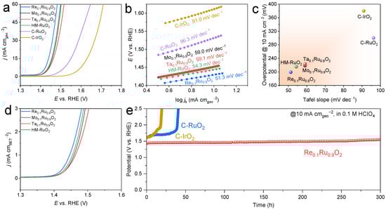 OER performance of the prepared electrocatalysts in 0.1 M HClO4. (a) LSV curves. (b) Tafel plots. (c) Comparison of overpotential and Tafel slope among M0.1Ru0.9O2 (M = Re, Mo, Ta), HM-RuO2, commercial RuO2, and commercial IrO2. (d) Specific activities of the prepared catalysts (OER currents normalized by BET surface area). (e) Chronopotentiometry tests of Re0.1Ru0.9O2, commercial RuO2, and commercial IrO2 at 10 mA cm−2.