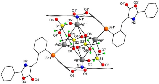| Ag1−O9’ | 2.6514(56) | N1−Ag1−O10’ | 69.19(20) | Se1’−Ag2−O9’ | 119.69(13) |