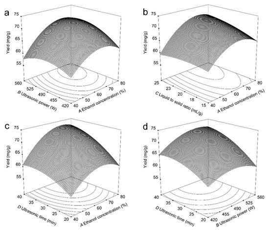 Three-dimensional surfaces generated from BBD: (a) the interaction effects of ethanol concentration (A) and ultrasonic power (B) on PCE yield; (b) the interaction effects of ethanol concentration (A) and liquid-to-solid ratio (C) on PCE yield; (c) the interaction effects of ethanol concentration (A) and ultrasonic time (D) on PCE yield; and (d) the interaction effects of ultrasonic power (B) and ultrasonic time (D) on PCE yield.