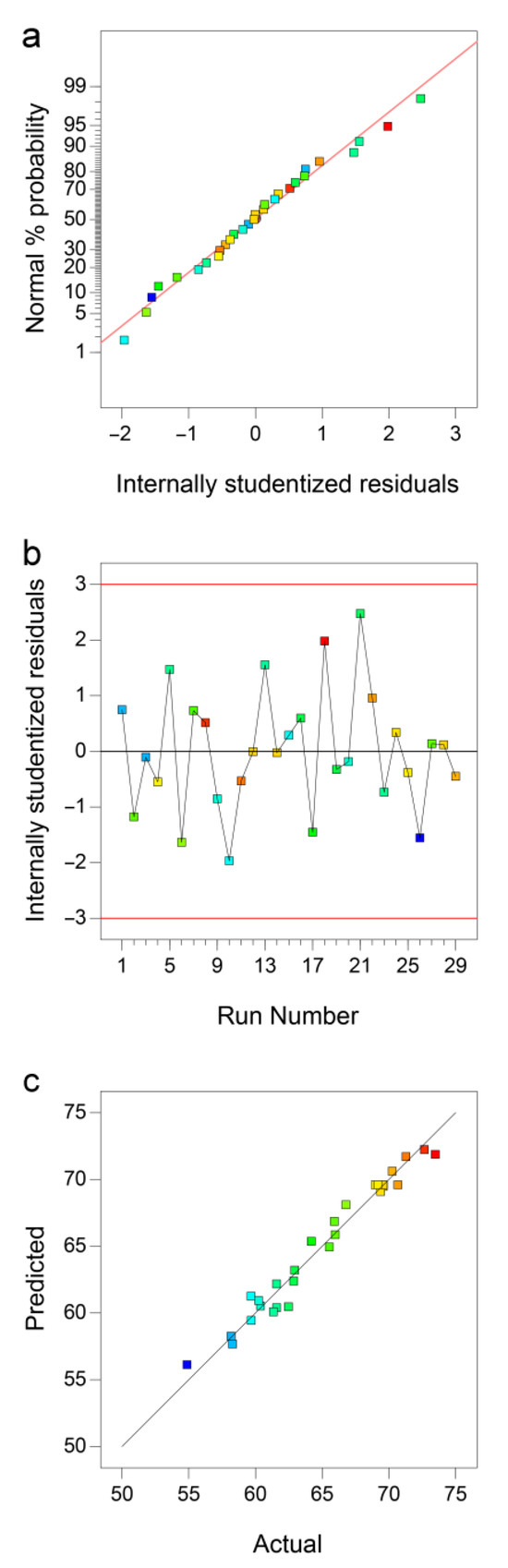 An investigation of the adequacy of the model could reveal whether the model produces incorrect or deceptive results. Figure 2 shows the three diagnostic charts for the adequacy test of the developed model, which include a normal graph, a graph of the residual versus run number, and a graph of the predicted versus actual responses. As shown in the normal graph (Figure 2a), the residuals of the response values normally spread as they lie closely on a straight line and do not reveal variance deviation. Figure 2b shows a plot of the residuals versus the run number. The good fit of the developed model was examined by establishing the internal studentized residuals versus the number of experimental runs, and it was found that all values fell randomly in the range of −3 to 3. A validation of the model is crucial, and this is accomplished by running several diagnostic tests. The predicted-versus-actual graph (Figure 2c) shows that the data points along with the straight line were linearly distributed, which suggests that the model was almost able to estimate the original experimental points [38]. According to these three diagnostic graphs, the established model is capable of the optimizing the UAE process for obtaining C. camphora leaf PCEs.