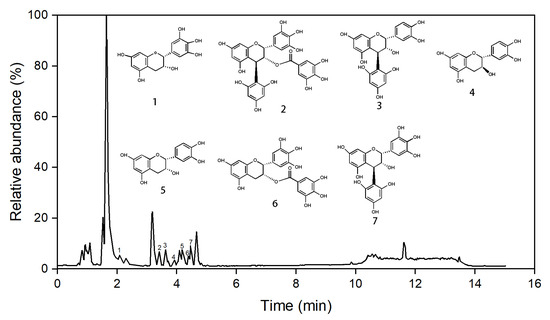 Figure 3 shows the UPLC chromatograms of the C. camphora leaf PCEs. The high-resolution mass was computed at negative mode to further characterize these peaks. The results are summarized in Figure 3, the Supplementary Materials, and Table 3. The identification of phloroglucinolysis products was on the basis of standards and a comparison with the literature. Manual characterization was performed by the investigating of the retention times, UV–vis spectra, and [M-H]−. Seven compounds with different molecular masses were identified in the tested samples. As shown in Figure 3 and Table 3, the retention times of these seven peaks exhibited on the chromatograms (Figure 3) were as follows: (1) 2.08 min, (2) 3.40 min, (3) 3.63 min, (4) 3.92 min, (5) 4.17 min, (6) 4.39 min, and (7) 4.48 min, respectively. On the basis of standards, four peaks (Table 3 and the Supplementary Materials) of 1, 4, 5, and 6 had their ion peaks at m/z 305.0669, 289.0719, 289.0716, and 455.0984, which were the intense [M–H]− peaks of EGC, C, EC, and EGCG, respectively. Meanwhile, peaks 2, 3, and 7 gave the parent ion peaks ([M−H]−) at m/z 583.1103, 413.0876, and 430.0387, respectively. These peaks have been characterized by previous reports, and the present results are in accordance with reference data [42,43,44,45]. Therefore, the structure of these three peaks were analyzed as presented in Figure 4 and were identified as (−)-epigallocatechin-3-O-gallate-(4β-2)-phloroglucinol (EGCGP), epicatechin-(4β-2)-phloroglucinol (ECP), and epigallocatechin-(4β-2)-phloroglucinol (EGCP), respectively. Based on the literature [42,43], EGC, C, EC, and EGCG were recognized as terminal units and EGCG, EC, and EGC were identified as the extension units of C. camphora leaf PCE.
