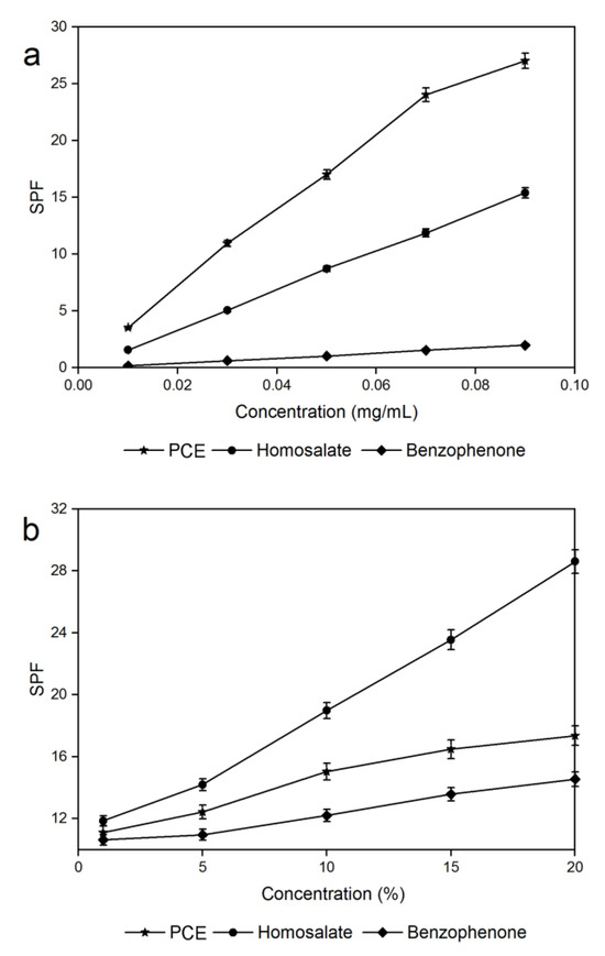 Figure 4 shows the results of the UVB protection capacity of the C. camphora PCEs. The sun protection factor (SPF) of the PCE ethanol solution gradually increased with an increasing concentration (Figure 4a). Meanwhile, the PCE ethanol solution showed higher SPF values than the commercially available sunscreen additives (benzophenone and homosalate) under the same concentration. This indicates that PCE ethanol solution has an excellent UVB-absorption ability. Figure 4b displays the SPF values of these three sunscreens under different concentrations. The SPF values of these three sunscreens increased when their concentrations increased. Compared to the commercially available sunscreens, the PCE sunscreen was inferior to homosalate but superior to benzophenone, indicating that C. camphora PCEs are a promising alternative to the commercial additives used as a natural sunscreen additive. Based on the study by Sierra-Cruz et al., proanthocyanidins are a class of flavanol monomers and polyphenolic compounds of their polymers [46]. The present study also shows that C. camphora PCEs are made from polymerized EGC, C, EC, and ECG. The common structural features of these units are aromatic rings and phenolic hydroxyl groups, so we deduced three reasons as to why the C. camphora PCEs had a desirable UVB-protection ability. (1) The aromatic rings and the phenolic structure exhibit an important role in UV absorption [47,48]. (2) Proanthocyanidins can scavenge reactive oxygen species generated by UV [49,50]. (3) Proanthocyanidins can regulate several signaling pathways in vivo to repair UVB-induced DNA damage [23,50]. This is consistent with the results of previous studies, in which proanthocyanidins possessed good UV absorption [51,52].