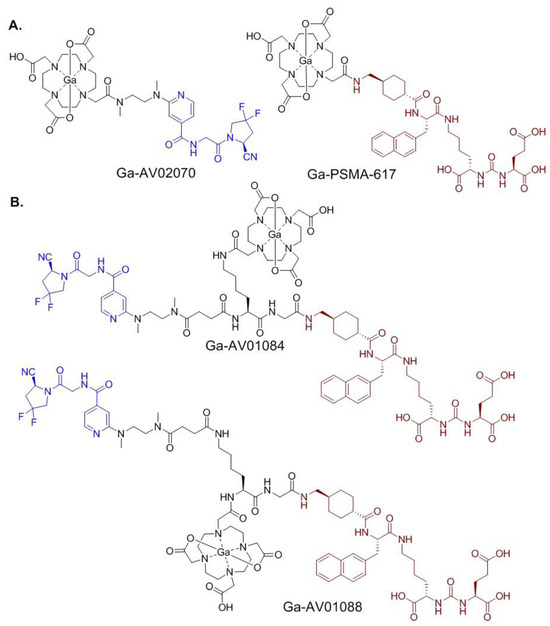 Chemical structures of (A) PSMA-targeted [68Ga]Ga-PSMA-617 and FAP-targeted [68Ga]Ga-AV02070; and (B) bispecific PSMA/FAP-targeted [68Ga]Ga-AV01084 and [68Ga]Ga-AV01088. The PSMA- and FAP-targeted pharmacophores are shown in brown and blue, respectively.