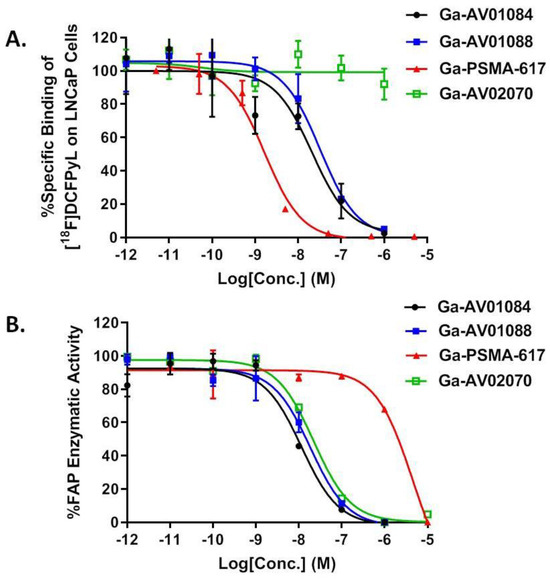 The enzymatic assay (Figure 2B) showed that the FAP-binding affinities of Ga-AV01084 (IC50 = 10.9 ± 0.67 nM) and Ga-AV01088 (IC50 = 16.7 ± 1.53 nM) were comparable or even slightly better than that of the previously reported Ga-AV02070 (IC50 = 17.1 ± 4.60 nM) [31]. We also measured the FAP-binding affinity of Ga-PSMA-617 to determine whether the PSMA-targeted pharmacophore has any effect on the overall FAP binding of our bispecific ligands or not. The very weak binding affinity of Ga-PSMA-617 (IC50 > 1000 nM) indicates that the potent FAP-binding affinity of our bispecific ligands is mainly due to the binding of the AV02070 pharmacophore.