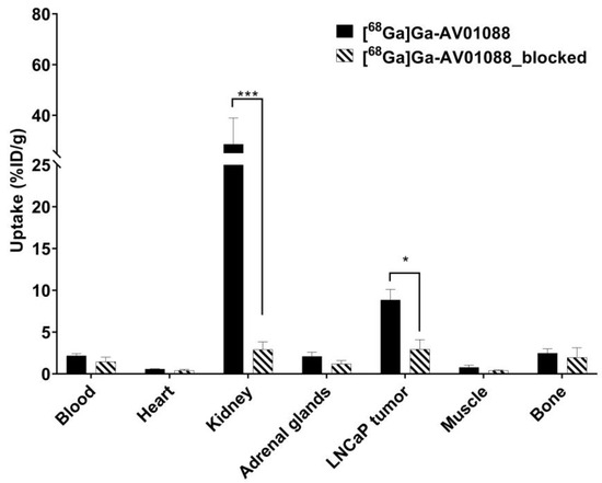 Comparison of [68Ga]Ga-AV01088 with and without co-injection of 2-PMPA on the uptake in LNCaP tumor xenografts and major organs/tissues in mice at 1 h post-injection. Error bars indicate standard deviation. * p < 0.05, *** p < 0.001.