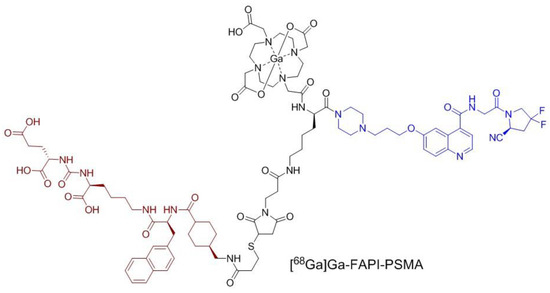 The chemical structure of [68Ga]Ga-FAPI-PSMA [27]. The PSMA- and FAP-targeted pharmacophores are shown in brown and blue, respectively.