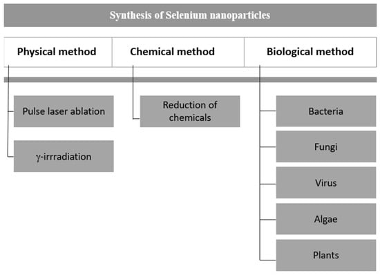 Since the utility of nanoparticles is dependent on their size, shape, and other properties, it is wise to choose the synthesis method according to the study. There are many ways of synthesizing nanoparticles, which are broadly segregated into three main methods: physical, chemical, and biological (Figure 2). We report the synthesis method for synthesizing SeNPs in detail to understand their properties.