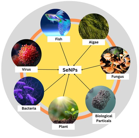 SeNPs are synthesized using different biological means such as fungi, viruses, bacteria, plants, algae, and other biological particles such as protein molecules (Figure 3). Plants have already been identified as being useful in the production of SeNPs. Raw materials are readily available, and many of these plants possess traditional and medicinal uses. Agricultural waste materials, including fruit peels, could also be used in the process. Plant materials high in polyphenols, saponins, flavonoids, alkaloids, polysaccharides, and other reducing and stabilizing agents have the best chance of succeeding. The phytochemical screening only found the most important active ingredients in a qualitative way [16]. Sharma et al. have reported a biological molecule-mediated synthesis of selenium nanoparticles as an alternative to the chemical method of synthesis. They used Vinifera fruits that were drenched overnight, crushed, and refluxed in distilled water for the extraction of filtrate that was refluxed with selenious acid for 15 min to synthesize SeNPs. They were then centrifuged and the SeNPs were collected. On the characterization of these nanoparticles, the size and morphology of the synthesized selenium nanoballs were 3–18 nm, as confirmed by TEM and FTIR spectrum results, which confirmed the presence of glucose and fructose content in the dried Vitis vinifera that acts as a reducing agent. Thus, the authors provided a simple ecofriendly method of synthesis of selenium nanoballs that can be employed for biological applications [37].